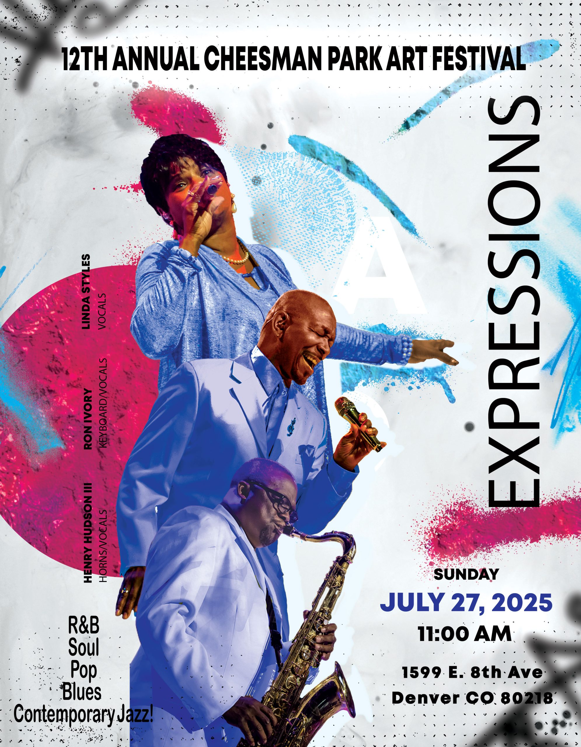 July 27, 2025 @ 11:00 am - 12:00 pm 12th Annual Cheesman Park Art Festival – Expressions: Linda Styles, Rob Ivory, Henry Hudson III Cheesman Park 1599 E. 8th Ave, Denver